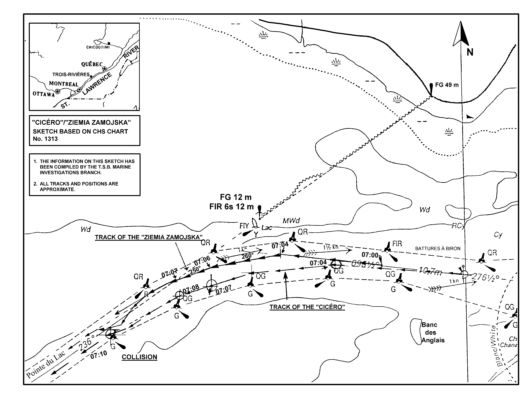 At 0634, the "ZIEMIA ZAMOJSKA" reported passing Pointe des Ormes to the VTC and gave an estimated time of passing Yamachiche, Quebec, of 0735. The following vessel, the "CICÉRO", reported passing Pointe des Ormes at 0645 and gave an estimated time of passing Yamachiche of 0725. These communications proceeded normally. At 0713, the pilot of the "ZIEMIA ZAMOJSKA" reported to the VTC that a collision had occurred with the "CICÉRO" at about 0710.