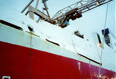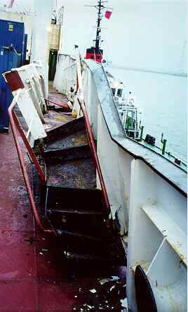The "ZIEMIA ZAMOJSKA" suffered limited damage under the accommodation ladder at the stern on the port side and above the main deck. The upper deck was set up over approximately 2 m. Two T-bars used for launching the lifeboat between the upper deck and the main deck were staved in and bent out of shape. The damage where the hull was staved in covered an area about 9 m long by 3.5 m wide.