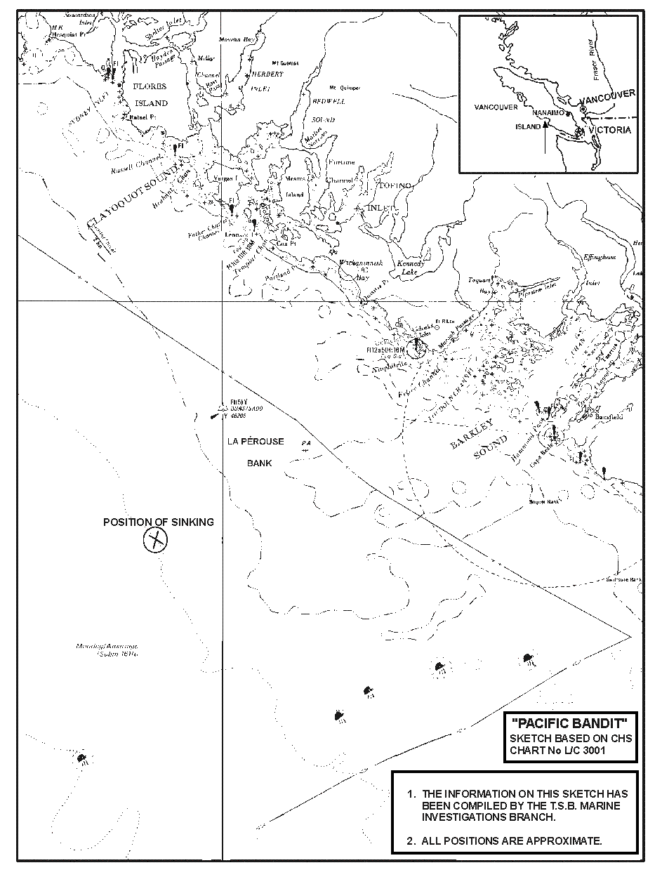 After partially replenishing fuel, and with a catch of some 22,700 kg of fish on board, the "PACIFIC BANDIT" departed Ucluelet, B.C. at about 1630Footnote 3 , 10 February 1995, for the fishing grounds 30 miles south-west of Amphitrite Point, B.C. The paravane stabilizers had been deployed to dampen the vessel's roll.