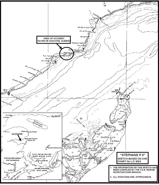 In this area, lobster fishing was scheduled to open on 28 April 1996. On the 27, the fishermen were therefore busy setting their traps in order to haul their first catches the next day. The weather was cloudy, and the wind was from the south-east at about three knots, but weather had been bad over the preceding days and the sea was still rough. The skipper/owner of the "STÉPHANE P II" loaded his vessel with lobster traps and waited for the weather conditions to improve before going to set his traps in the vicinity of Shigawake in Chaleur Bay, Quebec.