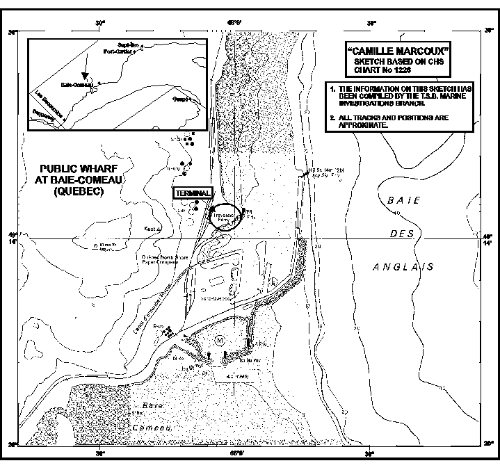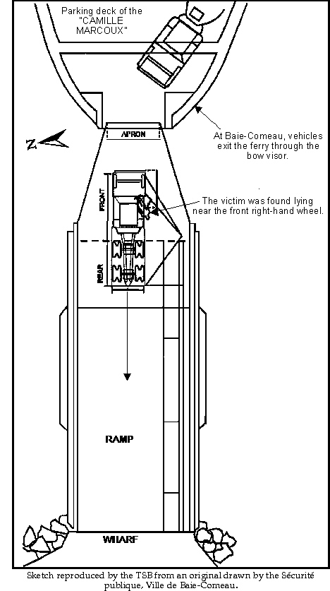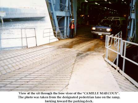 On 09 July 1996, while the "CAMILLE MARCOUX" was docking at the Baie-Comeau marine terminal, the vessel's bow visor was raised and Footnote 3The pedestrians aboard started across the loading ramp, followed by the 115 vehicles on board the ferry.