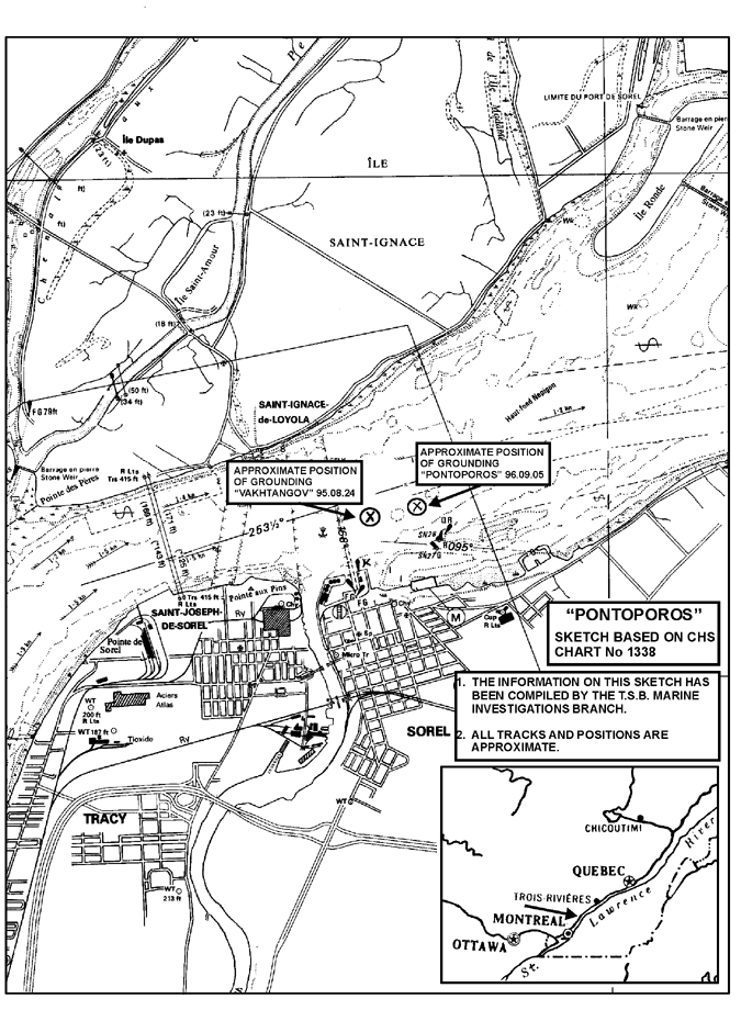 On 24 August 1995, the bulk carrier "VAKHTANGOV", with a draught of 10.21 m, grounded in position 46°03.76′N, 073°06.76′W, while attempting a similar manoeuvre to depart from the same dock. The "PONTOPOROS" and the "VAKHTANGOV" grounded at the edge of the shoal, south-east of the 10 m isobath.