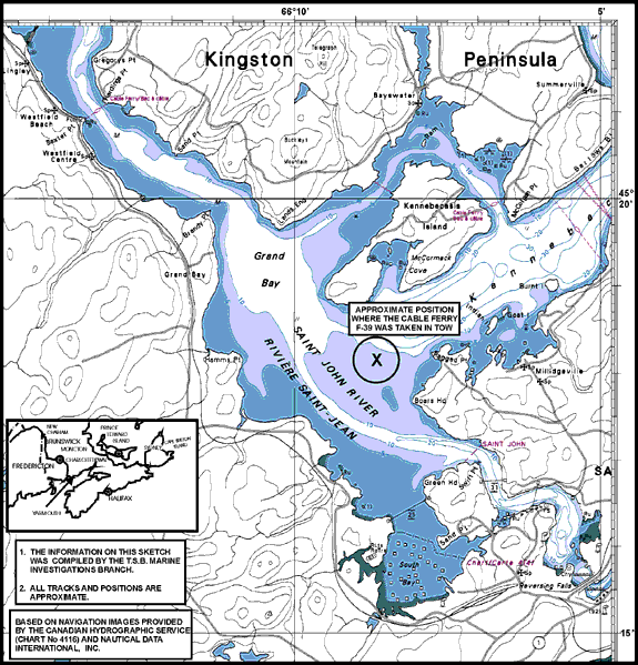 On the morning of 15 October 1996, the"F-79" was not in service and was not manned, and the "F-39" was the operational ferry. At about 1110, an automobile with two adults and one child was embarked at Hardings Point and the "F-39" began the crossing.Footnote 3 When the ferry was about halfway across the river, at about 1115, the cable parted and the ferry, which was now drifting free, began to be carried down river into Grand Bay by the high wind and river current.