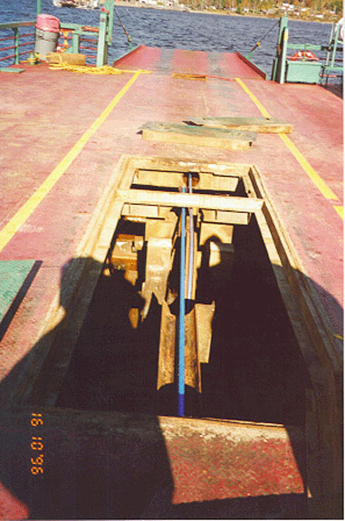 The ferry was fitted with two 20-person liferafts, stowed on racks above hand-rail level, one at each end of the car deck. The racks are so constructed that when the securing strap is released, the liferaft canister can roll freely down the rack, and overboard. Raft boarding would be via the ramp.
