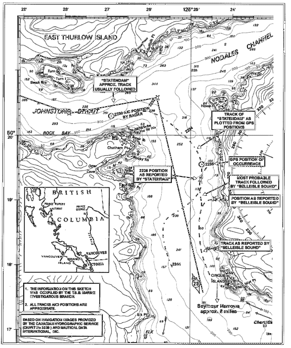 At 2230, Beaver Rock was bearing 138 T, four cables distant by radar. The light on the rock was barely visible through the fog, but its foghorn could be heard on the wheel-house loudspeaker. From the 2230 position, the vessel had a distance of approximately eight cables to travel to arrive at her charted southbound track in Discovery Passage. The shoreline of Sonora Island was 1.6 miles ahead.