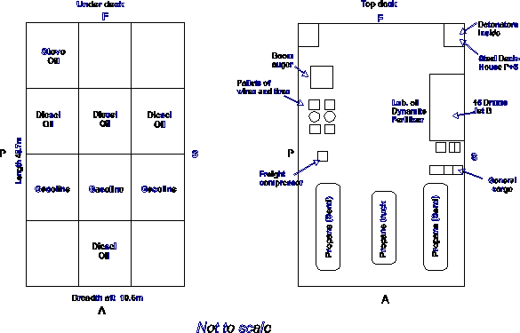 The barge was carrying general cargo for delivery to logging and fishing camps. In addition, the barge carried the following dangerous cargo on deck: 71,620 litres (L) of propane, 9,225 L of Jet B fuel, 1,250 kg of dynamite, 3,725 kg of ammonium nitrate explosive, and 10 cases of non-electric detonators. (See Appendix A for details of stowage and cargo distribution and Section 1.25 for Class, Division and Compatibility Groups of the dangerous goods in accordance with the International Maritime Dangerous Goods (IMDG) Code and the Dangerous Goods Shipping Regulations (DGSR)).