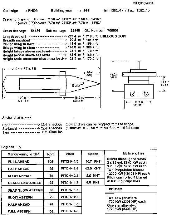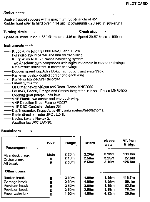The vessel has an enclosed wheel-house. Microphones are mounted outside the wheel-house to monitor outside sound. Propulsion and steering controls are located on the centre, port and starboard consoles. There is a computerized display unit and recorder for monitoring engine performance data. The distance from bridge to bow is 48.6 m, and 170.8 m from bridge to stern. Rate of turn, rudder angle, heel angle, and Doppler log indicators are located midships and at each side of the wheel-house.