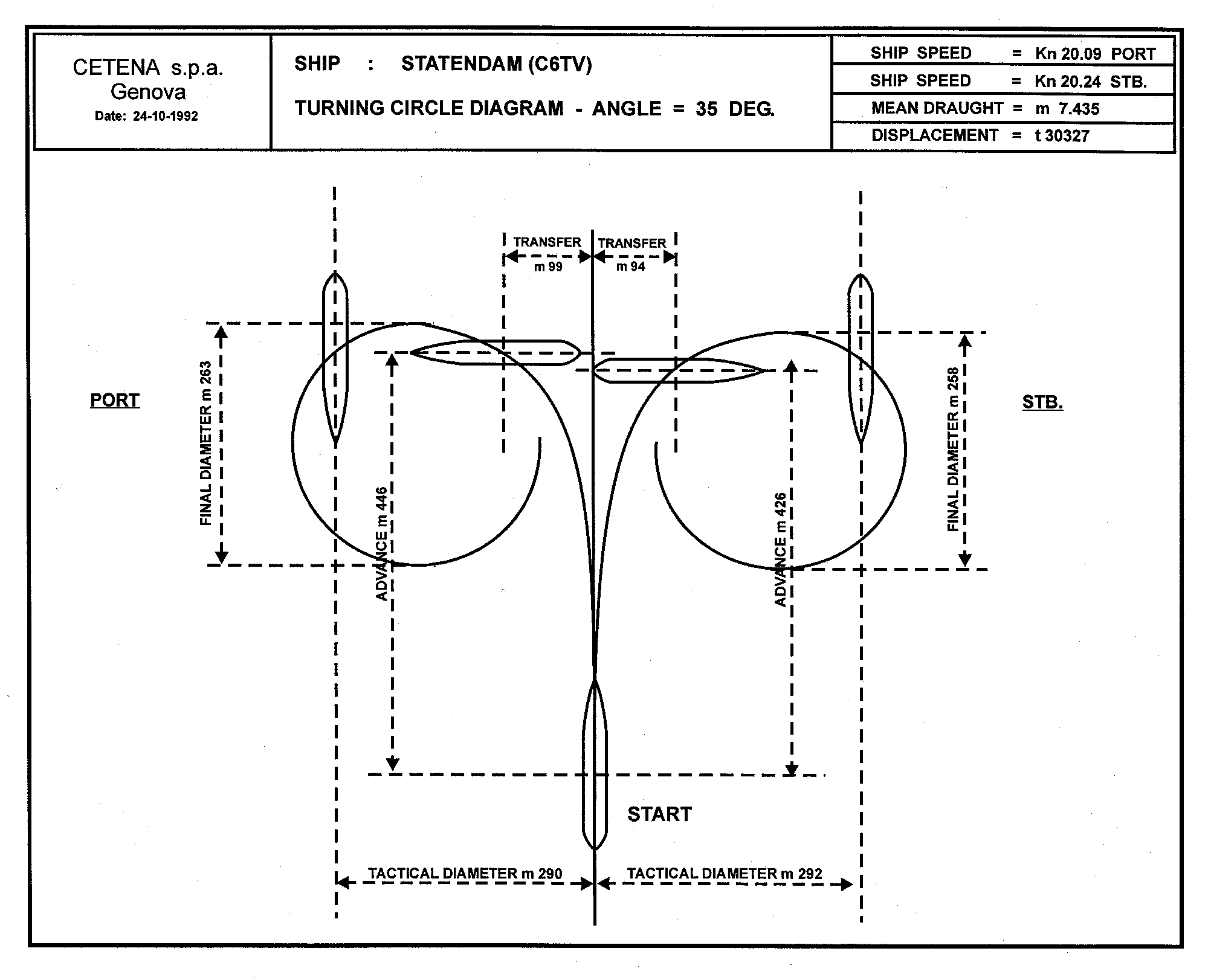 The vessel's sea trial data indicate that when the rudders are placed hard-a-starboard while travelling at 20.24 kn, the advance distance is 426 m, the transfer 94 m, the tactical diameter 292 m, and the final diameter 258 m. Crash stop distances and times estimations indicate that a crash stop would take 171 seconds and 899 m when carried out at 20.57 kn, and 141.4 seconds and 716.8 m at 16 kn.