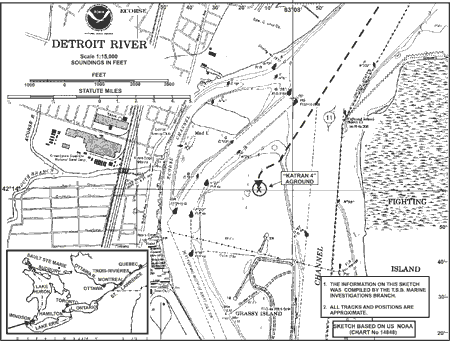 The Katran 4 was proceeding down the Detroit River in the foil-borne mode. When the vessel reached Fighting Island, where the main shipping channel divides into two deep-water channels, there was indecisiveness as to which channel the vessel should take. The vessel's speed was not slackened and the Katran 4 grounded in an area of shallow water between the two shipping channels. Those involved with the vessel's navigation had not been monitoring the vessel's progress and did not establish the vessel's position before the vessel ran out of the channel. There were no passengers on board at the time of the grounding.