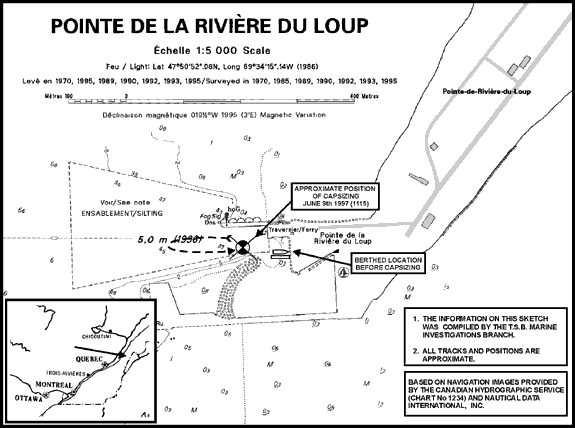 The vessel was tied up starboard side to a pontoon inside the marina at Rivière-du-Loup, while a mechanic carried out repairs to the port side outboard motor. Some wave crests occasionally shipped over the transom and were pumped overboard by the intermittent use of an electrically powered bilge pump located at the after end of the well deck. The orientation of the pontoon was such that it was aligned with the marina entrance, and the stern of the vessel was exposed to the prevailing winds and waves. Before the vessel's departure, winds of 10 to 15 knots were observed to be generally from the northwest, which generated waves with small white caps in the exposed waters of the St. Lawrence River, outside the marina. Where the water became shallower, near the entrance to the marina, the waves were reportedly shorter and steep-sided, and estimated to be approximately one metre high and rolling directly into the marina entrance.