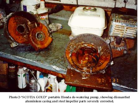 The portable Honda pump, carried as ship's equipment onboard the "SCOTIA GOLD", was dismantled ashore soon after the occurrence. The interior of the aluminium pump casing and steel impeller parts were found to be so heavily corroded that the pump could not work. (See Appendix A, Photo 2.)