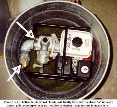The CCG pump unit had been packaged for SAR using a drum container originally designed for a portable pump unit made by another manufacturer. As purchased from the dealer, the Honda pump unit will not fit into the mismatched aluminium drum container. This unit had been adapted to fit the drum container by a local industrial equipment rental company. The pump's carrying frame had been shortened by sawing off and reshaping one end. Fitting of the adapted pump unit into the container forced the flanged suction pipe hard against the inside of the container wall. (See Appendix A, Photo 5.)