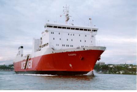 The MV "CICERO" is a steel-hulled vessel arranged with the accommodation forward. A container deck extends aft from the accommodation, below which are the ro-ro decks. The machinery space is midships, below the main ro-ro deck.