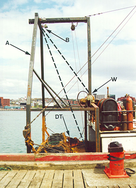 The galvanised steel wire lifting cable was 1.27 cm in diameter right regular lay 6 X 25 filler with an independent wire rope core. It was led aft from the topping winch drum, up to and through a 22.86 cm single sheave topping (lifting) block which hung from the centre line beam at the head of the "A" frame, and led down to the working deck.