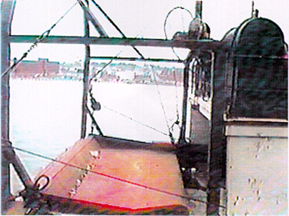 The dump table consists of a wooden platform bolted to a steel frame and enclosed with steel plating. It extends athwartships 4.9 m over the work deck, with a hinged attachment at the stern bulwark. The forward edge of the table measures 2.3 m from its hinges to the lifting lug and rests horizontally on steel legs to provide an underside clearance of 0.53 m above the deck. The weight of the table structure in a clean state is estimated to be 1.25 t (see Appendix A, Photo. 5).