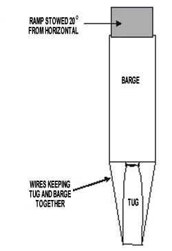 A wire from each quarter of the barge is made fast at the tug's stern.