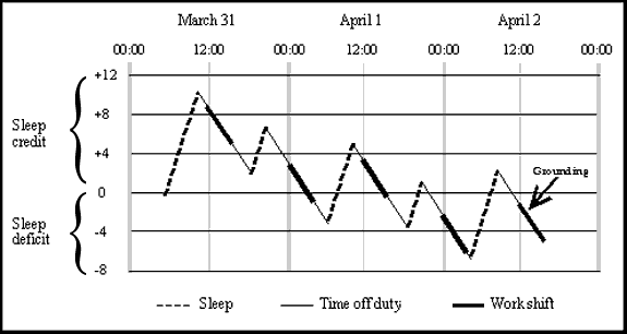 Figure 2 represents the 2/O's sleep history and accumulated sleep debt prior to the occurrence, based on the information provided by him. A rough calculation of sleep debt can be determined by allowing two hours of credit for every hour of sleep per day, up to a maximum credit of 16 hours, and one hour of debit for every hour awake.