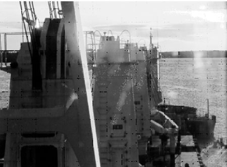 The vessel has five cranes forward, which were in the housed position. These cranes partially restricted the view forward such that a person stationed on the starboard side of the bridge could not see across the bow to the port side.