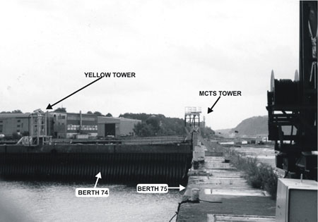 A group of communication radio towers located west of Fort No 1 at Pointe de Lévy are used by navigators as landmarks. The pilot used one of these towers abeam to judge the vessel's movement. In the foreground, he observed the shipyard's cranes; in the background, he noticed the 76.2-m VHF tower, which was illuminated.