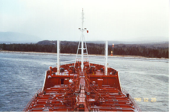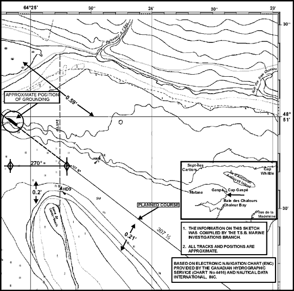 The rest of the transit towards the port of Gaspé on December 23 and the early morning of December 24 was uneventful. On December 24 at 0400, a routine change of watch occurred. The relieved OOW plotted the ship's position on the chart and passed all relevant information to the relieving OOW. The ship was approximately 7.5 nautical miles from the narrows at the entrance to Gaspé harbour, steering on the ranges that are 307.5° true (T), with the engine control at full ahead, and making good a speed of 12 knots.