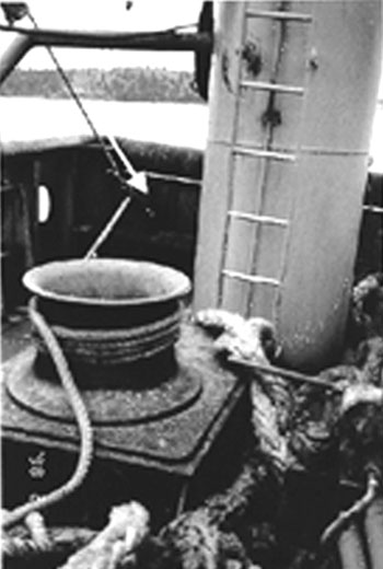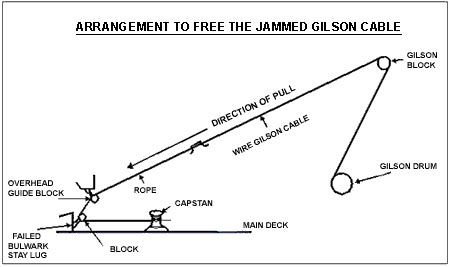 In order to free the jammed cable, a rope was harnessed to the end of the gilson cable. It was then led through an overhead guide block at the top of the port gallows frame, down through a yo-yo block with a working limit of five tons, attached at the aft bulwark, and led to a capstan winch located on the port side of the afterdeck. The master warned all hands to stand clear as the cables and rope under strain ran the full length of the working deck.