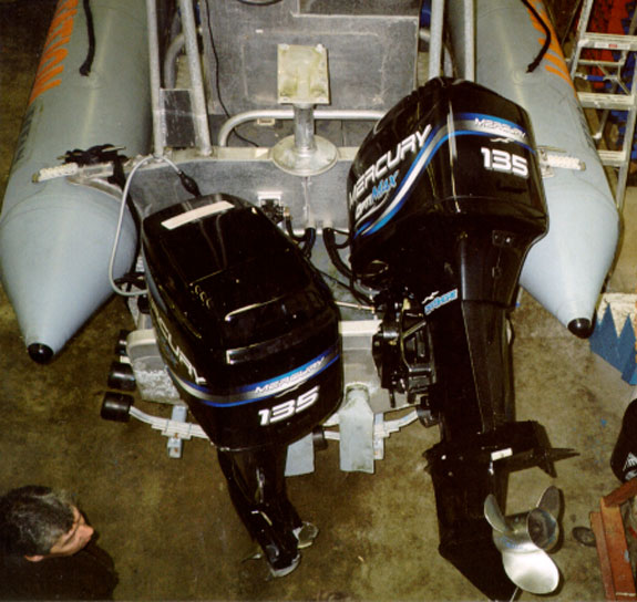 Mounted at the transom were two new Mercury outboard engines, with only about 60 hours of recorded running time on them. Two throttles mounted in the wheel-house provided remote control for the engines. Each engine was fitted with an emergency cut-off switch.