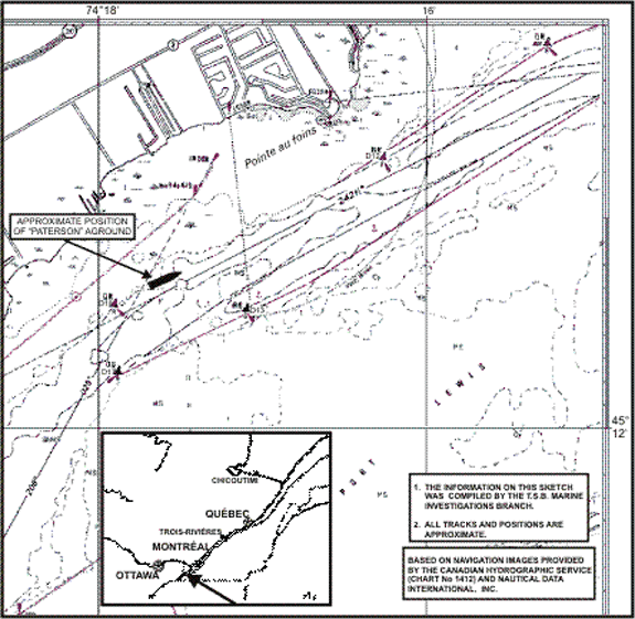 On the morning of 05 April 1999, the "PATERSON" was downbound on Lac Saint-François, proceeding at a speed of 11.5 knots. The vessel was loaded with 28 312 tonnes of corn, and bound for Sorel, Quebec. The visibility was good and early twilight offered a weak light. All systems were operating normally and the OOW, who was also performing pilotage duties since leaving Snell lock, was navigating by visual marks in conjunction with an electronic chart system (using a Starlink DGPS input), radar, and gyro compass. No position fixes were being plotted on the paper chart. Gyro error was minimal, at plus or minus 0.5 degree. A wheelsman was on duty at the central steering position to execute helm orders.