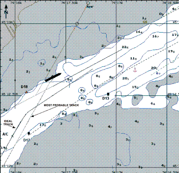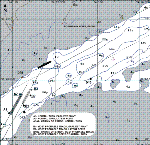 The standard downbound turning procedure, used successfully by the OOW in the past, was to make the turn in two steps. The first step consisted of a course alteration to starboard when the front leading light of Pointe aux Foins was ahead at a distance of 0.9 nm. At this point the vessel's head would be brought to steer on buoy D12. Once abeam buoy D13, the vessel's head would again be brought to starboard and steadied on a course of 062.5°G, with the Pointe Beaudette leading lights astern.