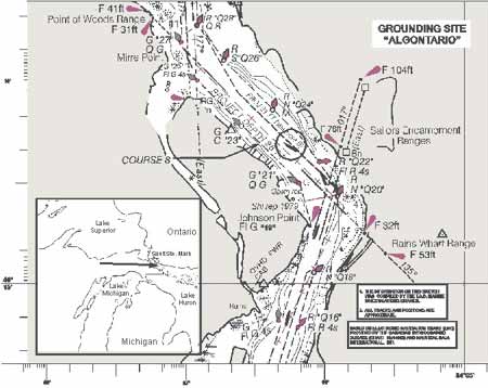 In the early morning of 5 April 1999, the Algontario was upbound in the St. Marys River. With the vessel abeam of Johnson Point light, the helm was put "hard to port" to make a 63° alteration of course into the Middle Neebish Channel. The vessel's turning circle increased and the rate of turn decreased due to squat and bank suction effects. The vessel overshot the turn for the deep channel and grounded in the 6.4 m (21 ft.) project depth channel between buoys Q20 and Q22. The channel was closed to upbound traffic until the vessel was refloated. Underwater surveys revealed that the hull suffered extensive damage to the bottom plating. The vessel was later dry-docked for temporary repairs.