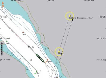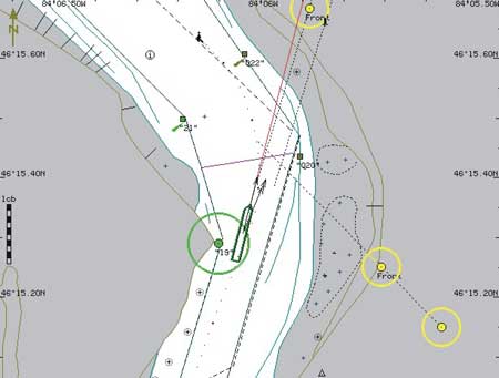 As shown on the ECDIS print out, at 0409 the ship's speed over the ground (SOG) was reduced from 10.9 to 7.2 knots (Position 5 on the throttle), as the vessel approached Mud Lake Junction buoy. The gyro was checked on Winter Point and had no error. The vessel's position was reported to the United States Coast Guard (USCG) Vessel Traffic Services (VTS), known as "Soo Control." At about 0435 the Algontario was steering on the Sailor's Encampment Range lights (Course 9) in the 8.23 m (27 ft.) project depth lane of the Neebish Channel. There was no ice or traffic reported in the vicinity of the vessel.
