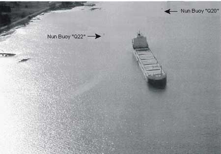 A USCG survey confirmed that buoys Q20 and Q22 were in their normal positions. After the refloating operations, the U.S. Army Corps of Engineers conducted a sounding survey to find if there was a hidden danger near Johnson Point. It was found that the deep and shallow draught channels conformed to their respective controlling depths of 8.54 m and 6.40 m, and that their actual physical depths at the time were approximately 0.03 m greater.