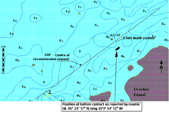 At approximately 0849, the master was satisfied with the ship's position abeam a small, unnamed point of land on the northwest side of Dowker Island at the predetermined distance of 213 m (700 feet). This put the vessel in the centre of the recommended navigation channel, and the master was now preparing to come abeam the next point of land on Dowker Island at 244 m (800 feet). Before 1996, the centre of the recommended channel was indicated by leading lights at Madore Point, but these lights had since been discontinued. The master and the mate had made numerous trips up and down the river in this area over the years, both before and after the leading lights at Madore Point had been discontinued. (see Appendix A).