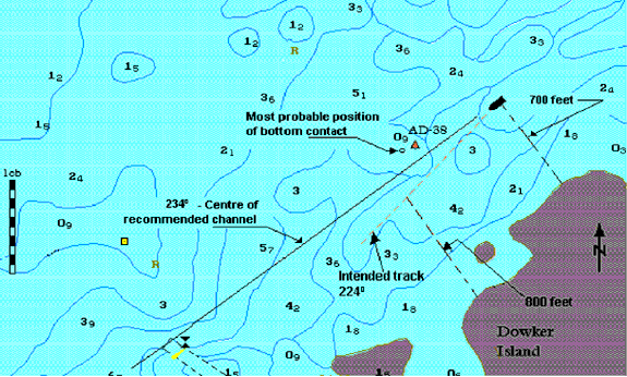 Both the master and mate had extensive experience in these waters, but they had never navigated in that area with water levels so low. The predetermined distances used successfully in the past by the master for passing up Lynch Channel and past buoy AD-38 have the vessel crossing the tip of a 1.83-m (6-foot) depth contour that overlaps the centre of the recommended channel, as seen in figures 1 and 2. In the past, with water levels consistently 0.9 m to 1.2 m (3 to 4 feet) above chart datum, this was not a problem. On this voyage, with the water level only 0.28 m (11 inches) above chart datum, the intended course brought the vessel in proximity to water depths of less than 2.10 m (6.9 feet).