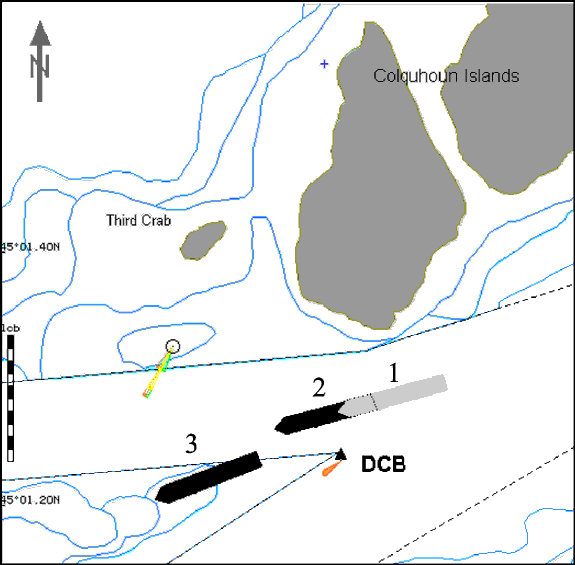Alerted by the order "hard to starboard," the pilot came to the assistance of the apprentice pilot, who asked him if the engines should be put "full astern." The pilot concurred and the order was given. The OOW put the engine telegraph to "full astern." The apprentice pilot then asked the OOW to telephone the engine-room to ask for "emergency full astern." The OOW complied with this order and, shortly after, the main engine was turning "full astern." At about 1155 the vessel ran aground on a 4.8 m shoal on the southern edge of the Cornwall channel, one cable upstream of buoy DCB.Footnote 4 The vessel's heading was 249(G) and the vessel had a slight starboard list of about half a degree. The master, who had just returned to the bridge, stopped the main engine.