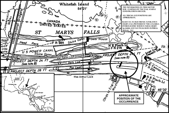 At 1745, the vessel advised Vessel Traffic Services (VTS) that the passage through the locks at Sault Ste. Marie and the St. Marys River would have to be conducted with one engine. Permission was granted by the United States Coast Guard (USCG) and Sault Ste. Marie harbour master.