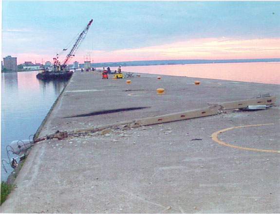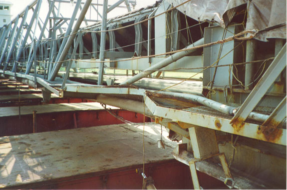 The unloading boom suffered extensive damage to its port forward and starboard after slewing cylinders when air trapped in the hydraulic slewing rams compressed and fractured the cylinders. The unloading hopper was damaged, as were the starboard catwalk and lower longitudinal, which were set in at the point of contact with the light standards.