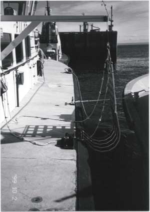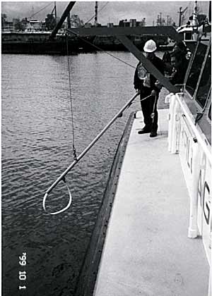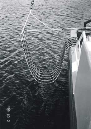 The Jason's cradle (recovery ladder) on the Charlevoix is stowed in a compartment on the main deck. Thus, it must be retrieved from the compartment, opened, and rigged by hooking two snap links through the eyes provided on the deck edge. To deploy the device in the shape of a cradle, the bottom of the ladder must be held in place by the line coming from the boom winch.