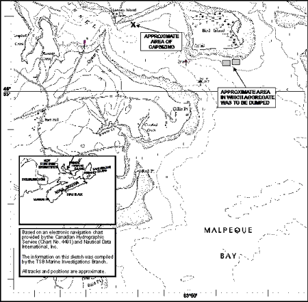 The vessel had been hired by the P.E.I. Shellfish Association to replace 127 m³ of previously dredged oysters, shells, mud and gravel in two areas south of Bird Island (see sketch of occurrence area, Appendix A). The normal procedure is to dredge an area that is not actively used by oyster harvesters. The material so dredged is landed and spread in an open area to weather over the winter months. After this period of "purification," the material is then relaid in an area where, spread out on the bottom of Malpeque Bay, it forms a bed for new oyster growth. This is an accepted method of enhancing oyster growth in this area of P.E.I. Normally, the number of live oysters in the dredged material was small, but in 1999 the percentage of live oysters was higher than normal, and the P.E.I. Shellfish Association was asked to replace the material in December, rather than wait till the following spring.
