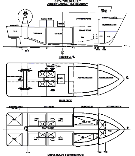 On the weather deck forward, a short foredeck is followed by an enclosed superstructure comprising the wheelhouse and crew accommodations. On the port side of the superstructure's aft and transverse bulkhead is a watertight door leading to the main working deck. A pursing winch is fitted on the centerline near midships. The hatch coamings of the four cargo tanks are divided into port and starboard compartments (see Appendix A). Fish-loading deck scuttles are fitted into and flush with the deck plating between the hatch coamings and bulwarks to port and starboard in way of the after end of the forward cargo tanks. Directly abaft the hatch coamings is a raised, athwartships-mounted net drum followed by a short after deck and transom stern fitted with a horizontal net roller.