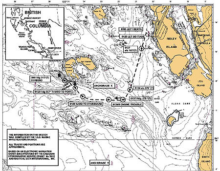 At about 0149 the helm was placed hard-to-starboard with the intention of coming around to an easterly heading to return towards anchorage "X". The OOW plotted the vessel's position at 0149 by GPS (Global Positioning System) and radar as being 54° 11.32′ N, 130° 22.22′ W, 5.8 cables from the southern tip of South Kinahan Island.