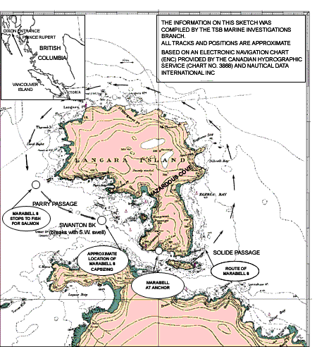 At approximately 0545, they arrived in the vicinity of Lacy Island and cast their fishing lines in the water. Before long, they found that the rain, southerly winds and large waves combined to make fishing very uncomfortable. At approximately 0605, they reeled in their lines and began a passage back to Marabell by following a course through the exposed waters of Parry Passage. At approximately 0630, in the vicinity of Swanton Bank, the boat was making a speed of approximately 12 to 15 knots when a large wave struck its starboard side. The boat capsized, throwing both of the occupants into the sea.