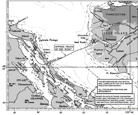 The Siyay departed Sea Island Base on the evening of 14 July 1999, for patrol and training exercises. The crew configuration consisted of the craft captain seated at the controls on the starboard side and the lookout occupying the forward port seat position in the control cabin. The first officer (navigator) and a SAR specialist were seated on the port and starboard after seats, respectively. At 2330 Pacific daylight time, the crew received a call from the Victoria Rescue Co-ordination Centre (RCC), just as they had completed night-time beach landing exercises on Shingles Point, Valdes Island, which is on the west side of the Strait of Georgia, some 16 miles from the entrance of the Fraser River at Sand Heads (see Appendix A).