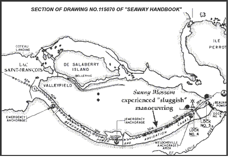 The apprentice pilot commented on the sluggishness of the vessel when leaving the shallow channel exit from the Beauharnois Lock No. 4 at a speed of only 6 to 7 kn. However, this is not an unusual phenomenon for a ship moving in a narrow channel such as the Beauharnois Canal, which has a depth of only 8.2 m (Appendix B, Sketch 1). This phenomenon would also exist for a ship navigating in the Lancaster Channel, where the depth of the water is only 0.5 m more than in the Beauharnois Canal.
