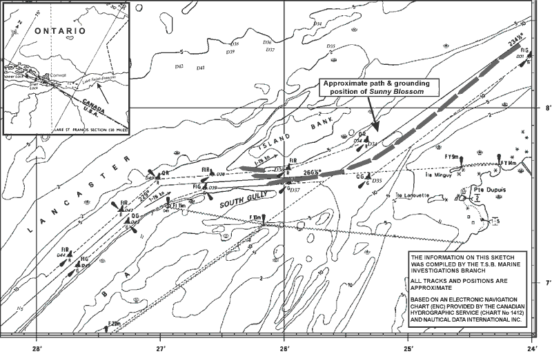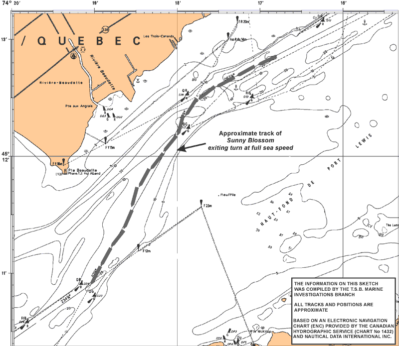 Bank suction and squat effects can produce changes in the vessel's directional stability, affecting its response to the helm. Steering difficulties while operating in shallow waters had been experienced on a previous occasion when, on 16 July 1999, the vessel was on a similar voyage to Cornwall.Footnote 7 Also, on 24 April 1999, the Sunny Blossom had ran hard aground in the U.S. section of the Seaway at the eastern entrance to Lake Ontario. On that occasion, environmental concerns were raised when the vessel required the lightening of its dangerous cargo.
