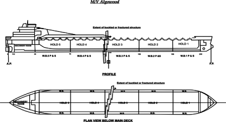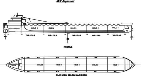 The Algowood is a self-unloading bulk carrier of all-welded steel construction, with five cargo holds. The propelling machinery, steering gear, wheelhouse, life-saving equipment, and all crew accommodation are located at the after end of the vessel. The location of cargo holds and water ballast tanks are shown in Figure 1. The hull is subdivided by transverse watertight bulkheads: a collision bulkhead, a bulkhead at the after end of the cargo space, and a bulkhead at the after end of the engine room.