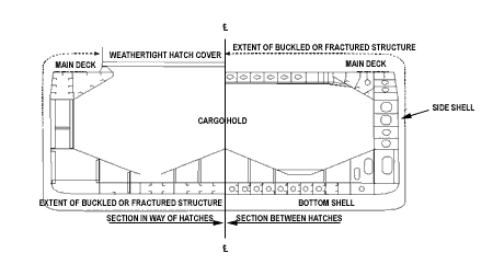 At 2345, while continuing to load into hatch No 3 of cargo hold No 1, the ship made a very loud wrenching sound and buckledFootnote 4 between hatches nos 13 and 14, in way of the transverse bulkhead, between frames 117 and 119. Loading was stopped and the general alarm sounded.