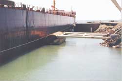 These calculations confirmed that, immediately before hull failure, the vessel was subjected to a hogging/bending moment about 2.3 times the maximum permissible (sea going). A hogging/ bending moment puts the main deck plating in tension and the bottom structure in compression. The hogging condition, induced at the time of the occurrence, was due to the excess of weight over buoyant support at the ends of the vessel.