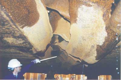 The Algowood experienced a sudden, major structural hull failure, the location, nature, and extent of which are shown in figures 3 and 4 and photographs 1, 2, and 3. Damage surveys, carried out when the vessel was alongside at Bruce Mines, revealed extensive buckling and distortion on the deck (Figure 4) above waterline P & S shell plating with localised buckling and tensile fracturing of the side shell and of the P & S ballast tank hopperFootnote 6 side.