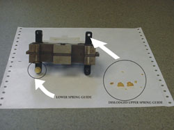 Pieces of yellowish polymer from one of the spring guides were found scattered around the inside of the contactor casing, and one of the guides was dislodged (Photo 1). Polymer can deteriorate after prolonged exposure to chemicals, heat, cold, stress, sunlight, oxygen, moisture, or pollutants in the atmosphere. Any of these factors, either individually or collectively, will alter the chemical composition of the material. Symptoms such as surface fragility, yellowing, cracking, or loss of elasticity and resilience are all signs of chemical deterioration.
