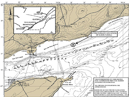 Although both anchors were let go, the vessel continued its swing to starboard. At 1201, the vessel grounded in position latitude 47° 27'48'′ North and longitude 070° 17'54'′ West, about two cables southwest of Cap Martin.
